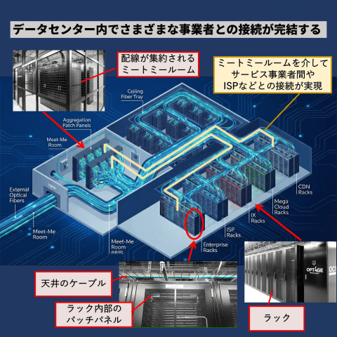 OC1では、外部から引き込まれた光ファイバーは、まず「ミートミールーム」と呼ばれる集約設備に引き込まれる。ミートミールームには、パッチパネルというケーブル同士を相互接続するための集約基盤が設置されており、そこから天井に引き回された光ファイバーを通じて、上部から各ラックへと配線される。天井からの光ファイバーは、ラック内へと引き込まれ、ラック最上部のパッチパネルを通じて、ラック内の通信機器やサーバーへと配線されるしくみだ。