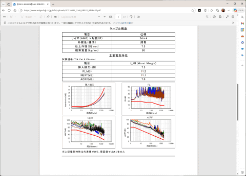 また、ケーブルメーカーによっては、テスト結果を公表しているケースもある。例えば、以下は少々古いものの冨士電線株式会社のプレスリリースだが、アナライザーを使った信号の損失やノイズの影響などのテスト結果が掲載されている。