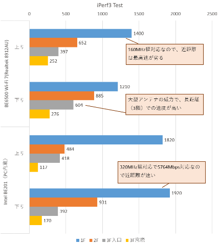 気になるベンチマーク結果だが、いつもののように木造3階建ての筆者宅にてiPerf3による速度を計測したところ、以下のような結果になった(Wi-Fiルーターにはアイ・オー・データ機器のWN-7T94XRを使用)。