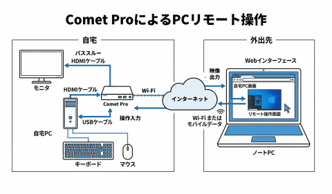 まずは、Comet ProをPCに接続する。PCとディスプレイは本来HDMIケーブルで直結されているが、その間にComet Proを接続して映像をネットワーク経由で伝送できるようにする。本製品はHDMIパススルーが可能なため、ディスプレイ側にも映像を表示しつつ、Comet Proにも映像を入力できる。さらに、Type-CのUSBケーブルでPCと接続し、キーボードとマウス操作をエミュレートできるようにする。最後に電源を接続すれば完了だ。