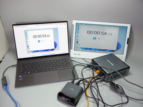 試しに、パススルーで外付けディスプレイを接続したローカル出力と、GL.iNetのクラウドサービス経由でリモート接続(別回線を利用してWAN経由で接続)時で、ストップウォッチの値を比較したのが以下の写真だ。