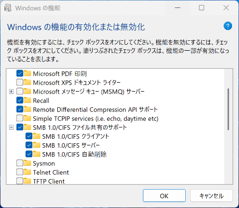 具体的にはSMB1.0となっているため、USBメモリやUSB SSDを接続し、Windows 11から共有フォルダーにアクセスしようとしても通常はエラーが発生する。現状のWindows 11ではSMB1.0は無効化されているため、「Windowsの機能の有効化または無効化」で「SMB1.0」を追加しないと共有フォルダーにアクセスできない。