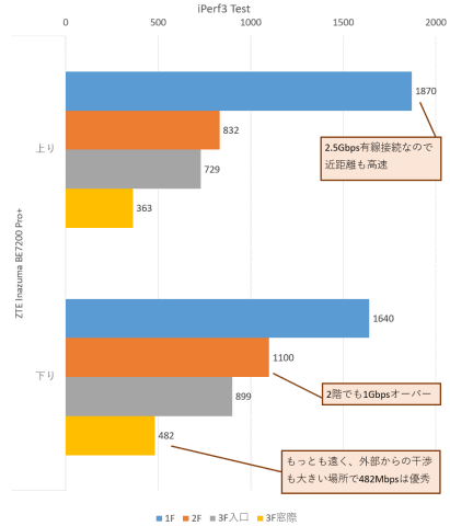 1階の近距離は、2.5Gbpsの有線LANでサーバーを接続できることから、上り1870Mbps、下り1640Mbpsときちんと1Gbpsオーバーの速度で通信できている。