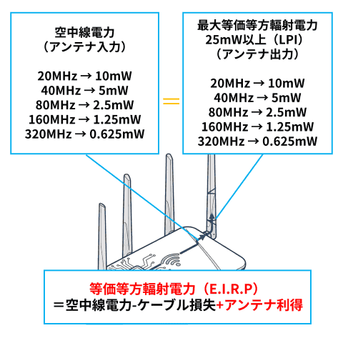 前述したように、Wi-Fiの電波の出力は、アンテナに入力する空中線電力とアンテナから出力される等価等方輻射電力(E.I.R.P.とも呼ばれる)で規定されているが、これには次のような関係がある。