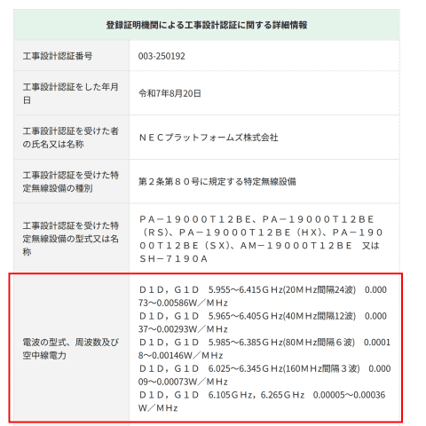 実際の製品の空中線電力がどれくらいなのかは、技適の情報を検索すると簡単にわかる。