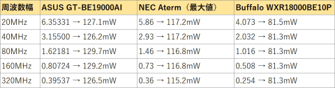 この値を製品ごとに比べてみるとなかなか興味深い。下表は、ASUSの「GT-BE19000AI(発売予定)」、NECプラットフォームズの「Aterm 19000T12BE」、バッファローの「WXR18000BE10P」の空中線電力をまとめたものだ。値は、「1MHzあたりの電力→帯域幅をかけたトータルの電力」という記述をしている。