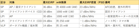 Wi-Fi 7の6GHz帯を例に見てみよう。Wi-Fi 7の6GHz帯は、屋内外どちらでも利用可能なモバイル用途向けの「VLP(Very Low Power)」と屋内専用の「LPI(Low Power Indoor)」の2つの規定があるが、このうちWi-Fiのアクセスポイントに適用されるLPIは、空中線電力(アンテナに入力する電力)および最大等価等方輻射電力(アンテナから出力される電力)が以下のように定められている。