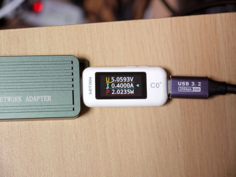 本製品は、スペック上の消費電力が1.95W、実測でも2.0W前後となっており、低消費電力で動作する。筆者の手元にあるThunderbolt 4/USB4接続のAQC113搭載アダプターはスペック上の消費電力が2.5Wとなっているものの、実測では3.9W前後と高くなっており、これと比べると、かなり消費電力が抑えられている。