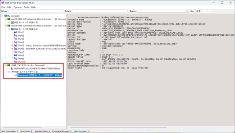 そこで、USB解析の強い味方「USB Device Tree View」を利用して接続状況を確認してみた。