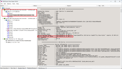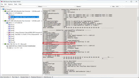 で、肝心のRTL8159がどのようにつながっているのかというと、上記の画面の右側の赤枠部分に注目してほしいが、「Device Connection Speed」の項目は、一応、「SuperSpeedPlus 20Gbps」となっている。