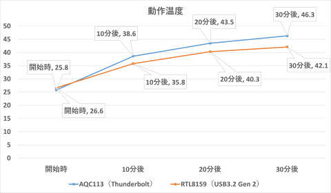 以下は、RTL8159搭載アダプターと、AQC113搭載アダプターで、iPerf3実行時の製品の表面温度を比較したグラフだ。いずれも筐体で放熱するタイプの製品なので、本体が熱くなることに過剰に反応すべきではないが、それでもRTL8159搭載製品の方が温度が低くなっていることが分かる。