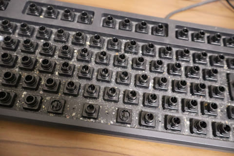 外し方のコツをつかみつつ、キーキャップを全て外したことで、これまで隙間から少し見えていただけの汚れと直接対面できた。ホコリ、食べ物のカス、髪の毛などの汚れが3年分蓄積されていて想像以上に汚く、この記事上で写真を公開して良いものかと悩み、編集部内で確認をしていたくらいだ。
