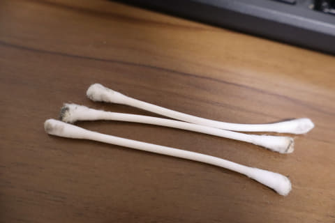 次は、隙間を無水エタノールで掃除していく。キーボードの素材によっては、変色・変質してしまう可能性があるため、念のため目立たないところで試しておくといいだろう。綿棒に無水エタノールを付け、擦っていくことで隙間の汚れがしっかり落ちていく……はずだった。