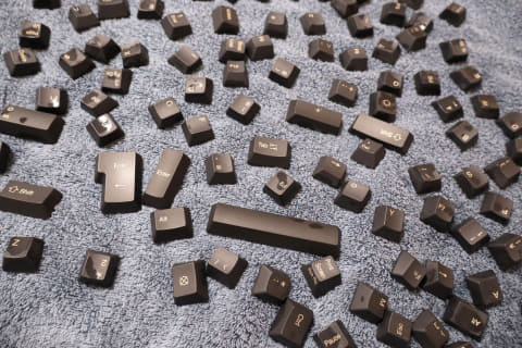 洗ったキーキャップは水滴を拭き取ったあと、バスタオルの上に並べて乾かしておく。タオルの上で軽く揺らしたり叩いたりして隙間に残った水滴を落とすことで、乾くのが少し早くなる。キーボードをキレイにするための作業で壊してしまっては元も子もないので、念入りに乾かしておいた。筆者の場合は半日ほど放置していた。