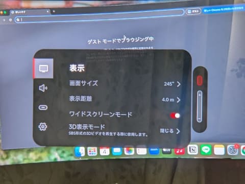 XREAL Oneに映し出される画面は最大367インチで見ることができる、と公式サイトでは記されていますが、後述するIPD(瞳孔間距離)によって設定できる大きさが変わり、私が試した-6段階では最大419インチの設定ができました。