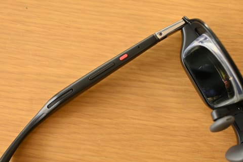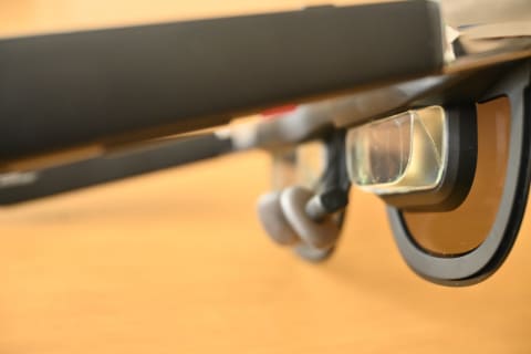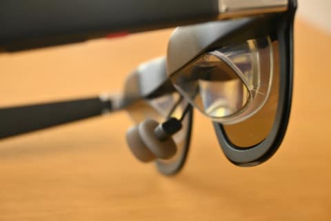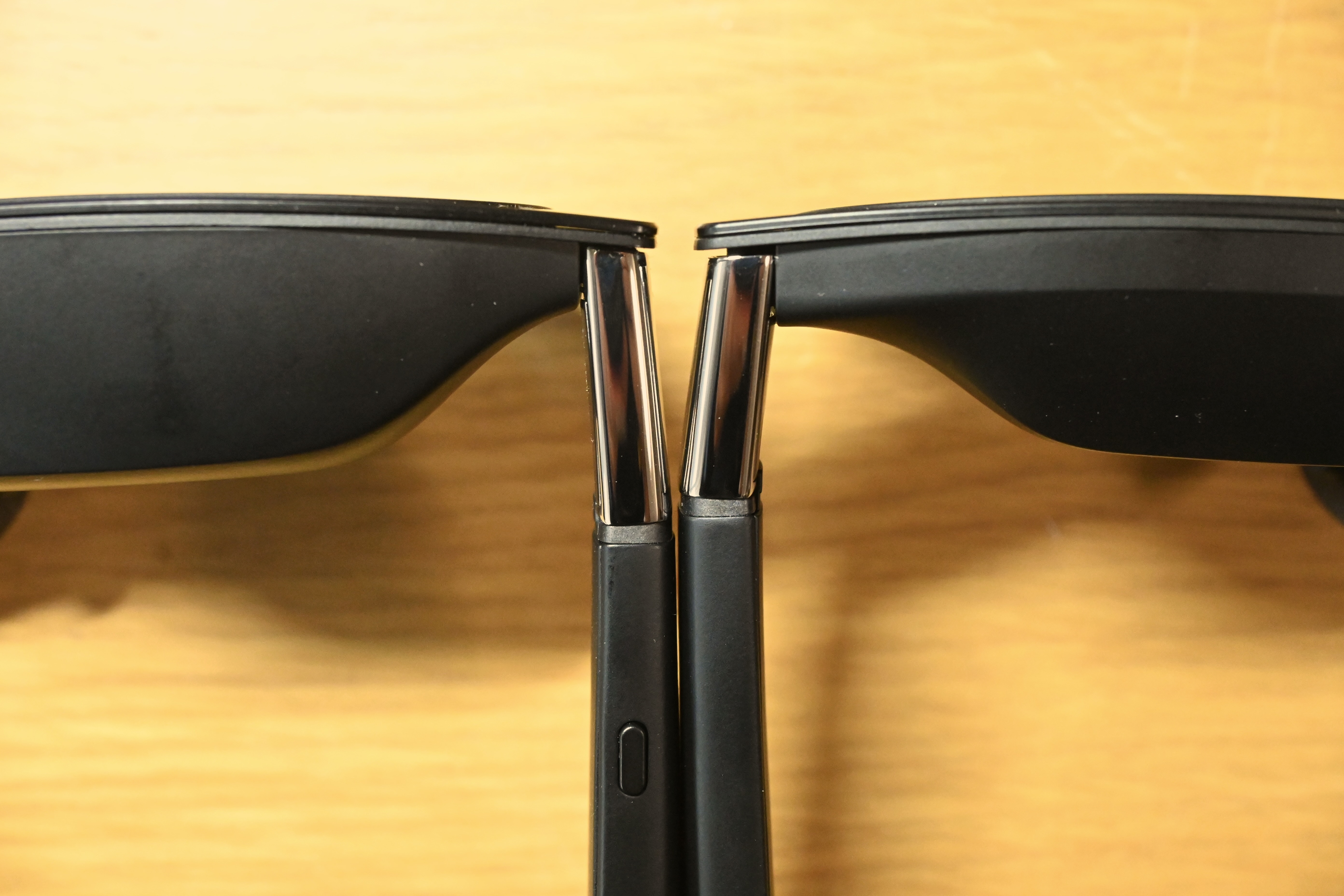 個人的に「これはかなり大きな違いでは?」と思ったのが、XREALの装着感です。本体サイズはいずれも約53×14.8×15.5(天地幅×フレーム幅×テンプル長)と変わらず、重量もOneが約85g、One Proが約91gとOne Proの方が若干重い程度。しかし、レンズ部分、とりわけ光学系(レンズ中央の透明の部分)の厚みは分かりやすく違います。Oneの光学系は上部が厚く下にかけて薄くなっている逆三角形型なのですが、One Proの光学系は平らです。装着するとOneの方が少し重く感じました。