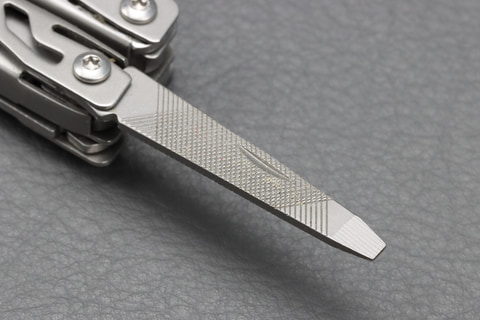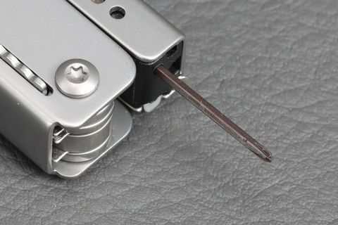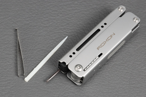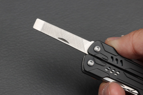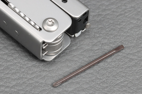もう片方の柄には、爪楊枝やピンセット、精密ドライバーが収納されている。爪楊枝やピンセットはビクトリノックスを彷彿とさせるが、まぁ使う機会は少ないだろう。爪ヤスリは、ヤスリとしてはちゃんとしたものが付いている。ただしサイズが小さいので、本当に爪を削るぐらいしか使い道はなさそうだ。