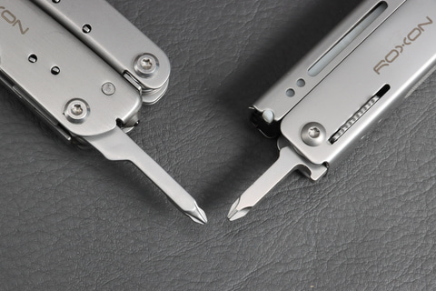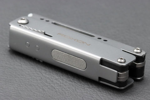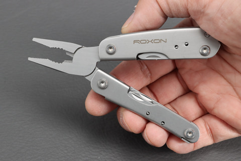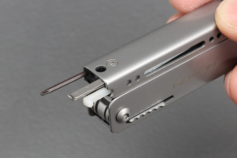 さらによくできているのが、これら内側のツールは、引き出したところでロックされる構造になっている。こうした折りたたみツールだと、強い力で作業したときに意図せず折りたたまれてしまうことがあるが、ロックされているので、そういった心配が少ない。しかもツールを出した後、再び折りたたむと、本体部分が柄になるので、全ての工具が、ちゃんと使いやすい。こうしたマルチツールだと、使いやすさは二の次にされることが多いが、ROXON M3はその点が非常によくできている。