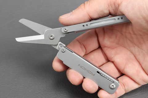 その閉じた状態から180°開くと、内側から刃が出てきてハサミになる。ハサミは一度に切れるのが最大27mmほどで、実用性は十分。そして開いた片方の柄の内側に、ナイフ、PH2のドライバー、ボックスオープナー、糸通しなどが収まっている。