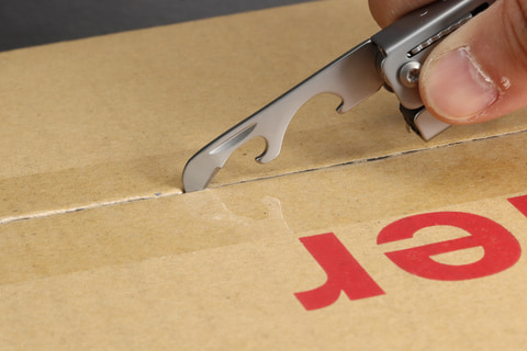そして特に気に入ったのがボックスオープナーだ。これは缶切りの刃の部分を鋭くしただけのものだが、段ボールの開梱でテープを切るのに便利だ。ナイフだと力加減を失敗すると、切りすぎて中のものを傷つける可能性があるが、ボックスオープナーは、引っかけて裂くイメージなので、深く切りすぎる可能性も低いし、それでいてテープだけはしっかりと切ることができる。レビュー用製品を開梱することが多い筆者にとって、これはかなり便利で気に入っている