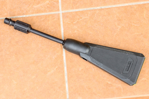 これもめちゃくちゃ良かった。というか、これはもう標準でつけた方が良いと思う。先にも書いたが、高圧洗浄機でキレイにしたい場所は、広い面積のことが多いので、線でいくらキレイになってもダメ。クルクルと円を描くタイプのノズルなどだと、ゆっくり動かさないと線状に汚れが落ちてしまって、かえって汚れが悪目立ちする。その点このeco!Booster 120は、幅広い面で掃除ができるので、床タイルやタイルの間の目地をキレイにするのにもちょうどいい。