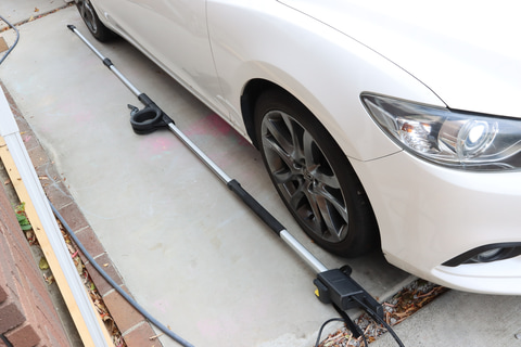 カーポートの屋根も掃除してみた。こちらはL字に曲げて使うので、真っ直ぐ伸ばす以上に倒れないように支える力が必要。ただし噴射を始めると、逆に押し返されるようになるので、そこをうまくバランスさせるようにすると、結構良い感じで使うことができた。