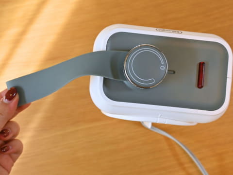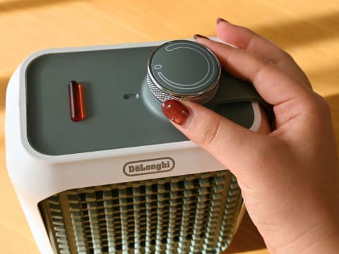 ダイヤル式の「サーモスタット」を回し切ってヒーターの電源を入れます。このサーモスタットは風量を調整するものではなく、電源のオン・オフを自動的に繰り返すことで、温度が上がりすぎないようにするもの。具体的な温度は明示されていないのですが、電源を入れたのち、ダイヤルを0に近づけるほど、オフになりやすくなります。スイッチを入れた直後は涼しい風がきますが、ものの2〜3秒ほどで温風に変化します。デスクに置くとかなり熱くなるのではと思ったのですが、20cmも離すとふんわりとした心地よい温風がやってきます。