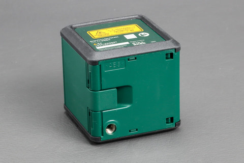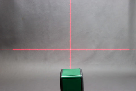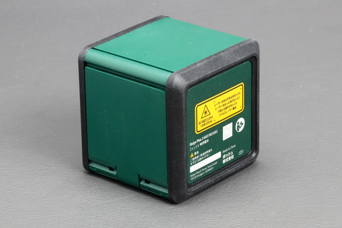 付属の電池を入れたらスライド式のカバーを開ければレーザーが照射される。本体の中にはレーザー光を発光する部分が振り子のような状態でぶら下がっているような構造で、最初はレーザー光もゆらゆらと揺れているが、本体を置いておくとすぐに揺れが収まって水平・垂直になるという仕組み。振り子は常にフリーの状態なので、近くを歩いたりして振動が伝わるとまた揺れる。