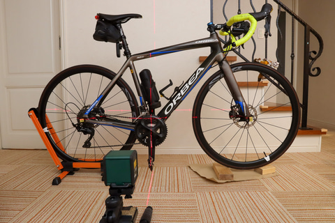 まずはスタンドに固定して自転車を垂直にする。ところが正面からレーザーを当ててみたところ、目視では分からないレベルで若干傾いているのが分かった。スタンドでも若干は傾いてしまうようだ。なので、その分は手で微調整。