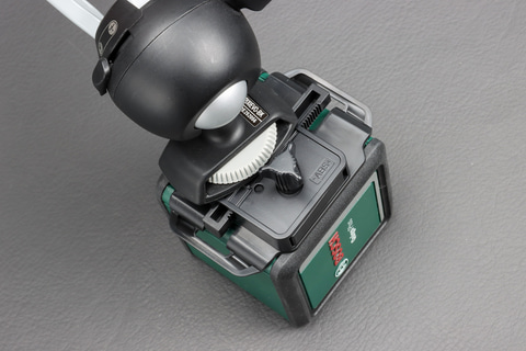 本体にスイッチらしいスイッチはなく、カバーを開けるとオン、閉じるとオフという極めて簡単な操作方法になっている。レーザー墨出し器だと水平を保つモードとロックしたモードを選べるものが多いが、QUIGO PLUSではロック機能はない。