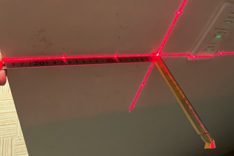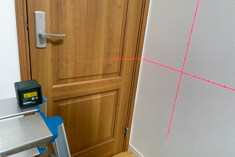 レーザー光を引ける長さだが、映写する壁からの距離によって変わって、およそだが壁からの距離の1.5倍ぐらいの長さラインが引ける感じだ(水平、垂直とも)。なので廊下やトイレの中など、距離が取れない場所での作業だと、引けるラインの長さが短くなってしまう。