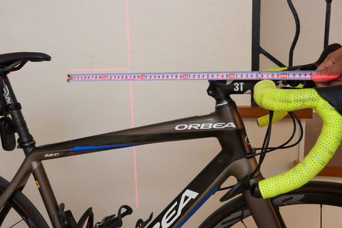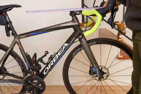 まずは水平のラインで前後車軸の高さをそろえた状態にしてから、垂直ラインをクランク軸(ペダルが取り付けられているアームの回転軸の中心)にそろえる。すると、クランク軸を中心としたサドルまでの水平距離やハンドルまでの水平距離を計測できるようになる。また、水平のラインをサドル高に合わせれば、ハンドルとの落差を計測できる。あとはクランク軸からサドル座面までの寸法を測っておけば、次のバイクを選んだりセッティングするときに参考にできるわけだ。