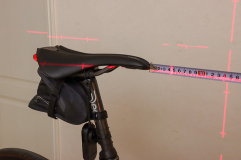 そこでハンドルの角度も調整すると、今度こそタイヤ、ステム、サドルまでが一直線になった。そこで今度は高さと距離を調整して、STIレバーの先端に目盛りが来るように調整する。黒いSTIレバーはそのままだとレーザー光が見えにくいのでマスキングテープを貼ってレーザー光を見やすくする。