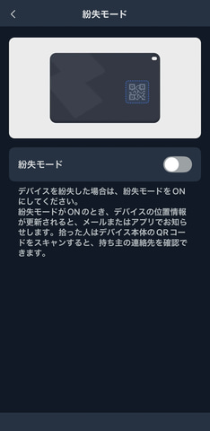 万が一スマートトラッカーカードを無くしたときの場合の、紛失モードの設定もSwitchBotアプリから変更できる。普段はオフにしておき、紛失したときにオンにして、自分の名前やメールアドレス・電話番号などの連絡先、そして伝言を入れることで、拾得した人にメッセージを伝えられるわけだ。