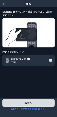 筆者宅はSwitchBot ロックを使っているので、カードキーとしても利用できるが、その設定はやめておいた。第一にこのカードは財布に入れておくので、万が一財布を盗まれたときに、免許証などから自宅の住所が割れた上にカードキーまであるのはリスクだと思ったからだ。加えて顔認証か指紋認証で解錠はできるし、どうしてもダメなら暗証番号でも開けられるので、NFCカードまでは必要ない、というのが理由だ。
