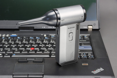 それが電動エアダスターと呼ばれるものだ。エアダスターと言うと缶スプレーのタイプが思い浮かぶが、これはその電動版。出社していたころは缶スプレータイプをオフィスの備品として使うことはあったが、テレワークメインになってからは使うことがなくなった。使い切りであること、ストックしておく場所、使い終わった缶の処分など考えると、「まぁそこまでしなくてもいいか」という気になっていた。