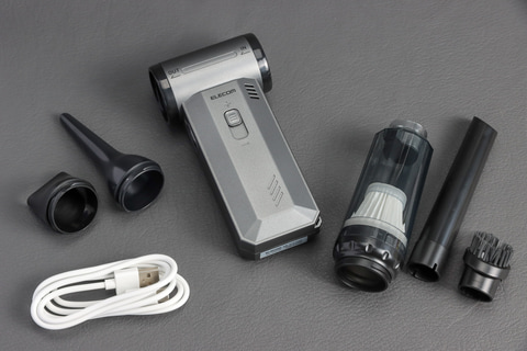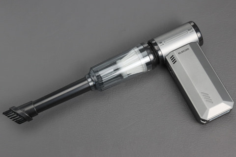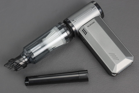 コンパクトという言葉でどれぐらいのサイズをイメージかは人によって違うと思うが、本体部分だけならスマホと同等の投影面積で、体積ならカメラ用のブロワーと同等ぐらいの印象。ただしあくまで本体のみでの話で、ノズルなどをつけると大きくなる。また、ノズル以外にも、掃除機として使うときのダストボックスなど、本体以外の付属品が多いので、置き場所が悩ましい。いいサイズの収納ボックスでもあればいいのだが。