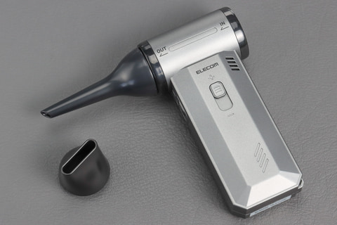 このあたりが使い方の違いで、缶タイプの場合、例えばキーボードのすき間にノズルを刺して内側のほこりを吹き飛ばすような、ピンポイントを狙った使い方ができるが、この電動エアダスターの場合、先細のノズルは付属するものの、そこまで細いノズルではないので、面で広い範囲のほこりを飛ばすような使い方が合っている。缶スプレーの細いノズルを使った掃除をイメージしていると、その使い勝手にギャップを感じるだろう。