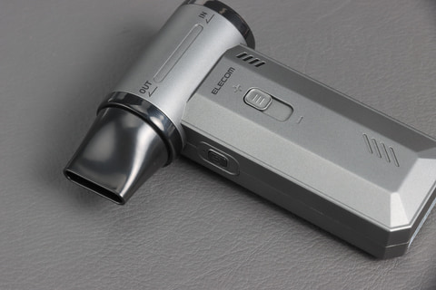 風量はスペック上で約20~55m/s。と言われてもピンとこないだろうが、最弱だとドライヤーの弱より弱いぐらいだろうか。夏場に顔に当てればハンディファン代わりに使えそうなぐらいの風量だ。これを最強にしてみると、けっこう強力で、この風量で顔に当てられるとイラっとするレベル。