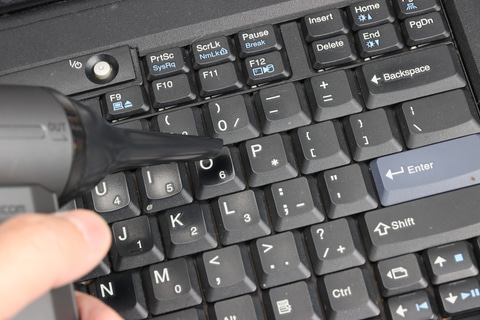 エアダスターモードとは逆の吸う側に掃除機として使う場合のダストボックスやブラシノズルをつけてキーボードのすき間をブラシでこするようにすると、すき間に入った小さいほこりやごみを一掃できる。