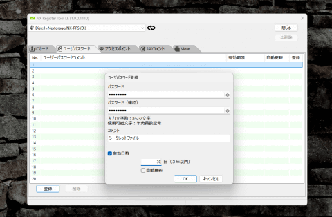 NX-PFS1PROがあれば同様のことができるかもしれません。このSSDはハードウェア暗号化機能でデータを守りつつ、解除方法を複数設けることで利便性を高めています。専用ソフトにより、ロックの解除を許可したICカードやアクセスポイントを最大20個登録できるほか、任意の文字列で解除するユーザーパスワードも同様に20個設定可能です。