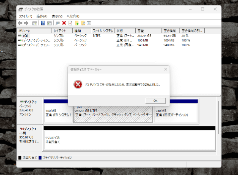 有効日数を1日に設定し、専用ソフトを入れたPCから外した上で24時間放置。すると、PCに接続しても外付けドライブとして反応しなくなりました。専用ソフトも操作不能で、手出しできません。であるならばと、Windowsの「ディスクの管理」から初期化を試みてもエラーが返ってきました。初期化して再利用することもできません。墓場まで持っていく狙いならこれ以上はない状態といえるでしょう。