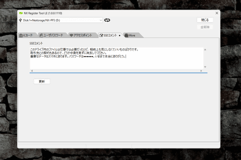 なお、NX-PFS1PROもみえるSSDシリーズと同じように、100文字強のコメントを付与することもできます。ただし、プロ版は暗号化を解除した状態でないと表示されないので、暗号化を解く前の家族にメッセージを伝えるといった使い方には向きません。今回の意図で役に立てるなら、有効日数中にパスワードを突破されてしまった場合の、泣きの一言くらいでしょうか。