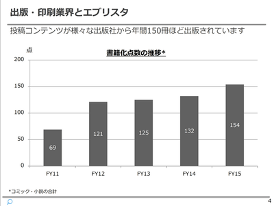 エブリスタへ投稿された作品からの書籍化は、年間約150点にも及ぶ(小説・コミックの合計)。「紙は出版社に任せる」というスタンスだ。出版社と協業で「エブリスタ小説大賞」を行うなど新人の発掘を行う一方、石田衣良氏の「小説家養成プログラム」など育成にも力を入れている。
