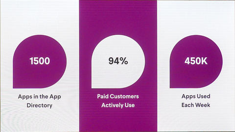 次いで登壇したSlack Technologies事業開発および経営企画担当副社長のブラッド・アームストロング氏は、Slackの重要な機能であるサードパーティーのアドインについて説明した。アームストロング氏は「オープンプラットフォームになっていることが重要で、それによりSlackの顧客はいつでも自分のビジネスに最適なツールを選択し、それをSlackと連携させることができる。それが我々の顧客が生産性を上げるために重要なのだ。既にそうしたアプリは1500も提供している」と述べ、オープンプラットフォームであることがSlackの哲学だと説明した。