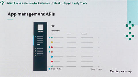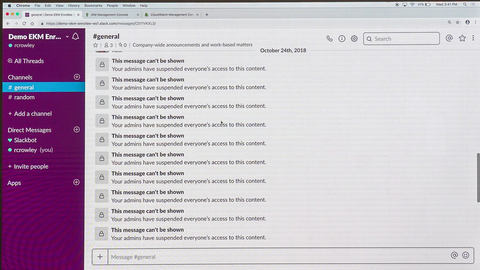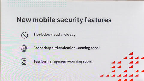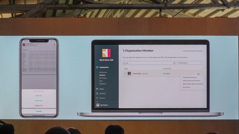 そして、モバイル機器のセキュリティに関しては、コンテンツのダウンロードやコピーの禁止、そして近日中に対応される予定のセカンダリ認証機能(Face IDや指紋認証など)、同じく近日中に対応する予定のセッションマネージメント機能を紹介し、特定のユーザーの端末からSlackのチャンネルへのアクセス権を剥奪し、端末に保存されているキャッシュをリモートで消去する様子をデモした。