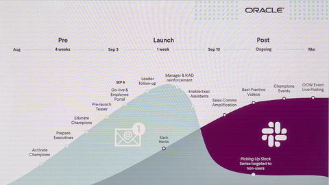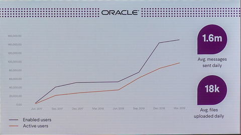 次いで、Slack Technologies副社長兼グローバルカスタマーサクセス&サービス責任者のクリスティーナ・コズマウスキー氏が壇上に上がり、Oracleコーポレートアプリケーションサービス担当副社長のポール・ドネリー氏とOracle APAC/EMEA 戦略・組織担当のスージー・アブラハム氏の2人を壇上に呼んで、OracleのSlack活用を説明した。この中で、Oracleはすでに15万の従業員がSlackを使っており、現在では毎日160万のメッセージがSlackでやりとりされ、毎日1万8000ものファイルがSlack上にアップロードされているということが紹介された。導入当初は連絡のほとんどは電子メールだったが、徐々にそれが減っていき、今では電子メールよりもSlackでの連絡の方が多くなっていることが紹介された。