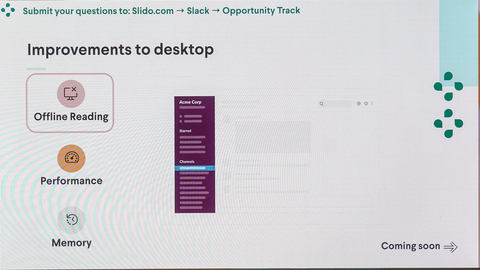 また、昨年のFrontiersで公開されたデスクトップアプリケーションの性能向上に関しても引き続き取り組んでおり、オフラインでもSlackのタイムラインを読めるようにキャッシュ機能の拡張、性能向上、さらにはアプリが消費するメモリ容量の削減などをターゲットとして開発を続けて行くと説明した。これらのデスクトップアプリケーションの強化は、WindowsとmacOSの両方をターゲットにしており、今後、投入される計画だ。