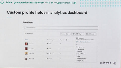 最後に登壇したSlack Technologiesプラットフォーム事業部グループ製品マネージャーのサルマン・スハリ氏は、「アナウンスオンリーチャンネル」と呼ばれる従業員へのお知らせ掲示板的に利用できる、指定した人しか書き込みができないリードオンリーのチャンネルの導入、ワークスペースの管理を自社開発のアプリなどからもできるようにするAdmin API、他アプリの管理をAPI経由で行なうことができるApp Management APIなどが近日中に投入、アナリティクスダッシュボードでカスタムプロフィールフィールドを設定できるようにする機能がすでに投入されていることなどを説明した。