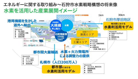 エネルギー面では、日本初の大規模洋上風力発電事業の開発を進めるなど、風力、LNG、バイオマス、太陽光など多様なエネルギー源を持つ。さらに2016年には、石狩市水素連略構想も策定。風力発電などの余剰電力から水素を製造し、港湾機能を使っての液化して貯蔵。港湾エリア内での燃料電池フォークリフトなどでの活用や、札幌都市圏へ供給、港から道外への輸出といった展開を目指して取り組みが進められる。